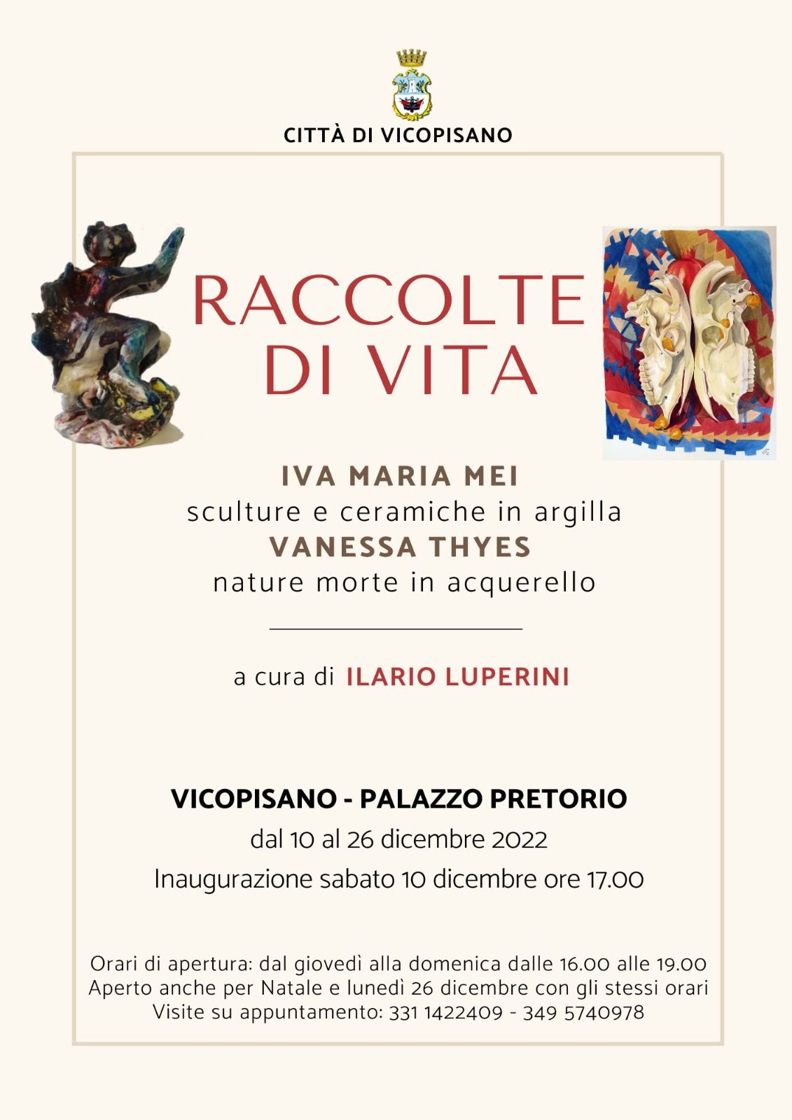 Mostra d'arte "Raccolte di vita" di Iva Maria Mei e Vanessa Thyes, a cura di Ilario Luperini. Si terrà dal 10 al 26 dicembre a Palazzo Pretorio, a Vicopisano, con inaugurazione alle 17:00 del 10.