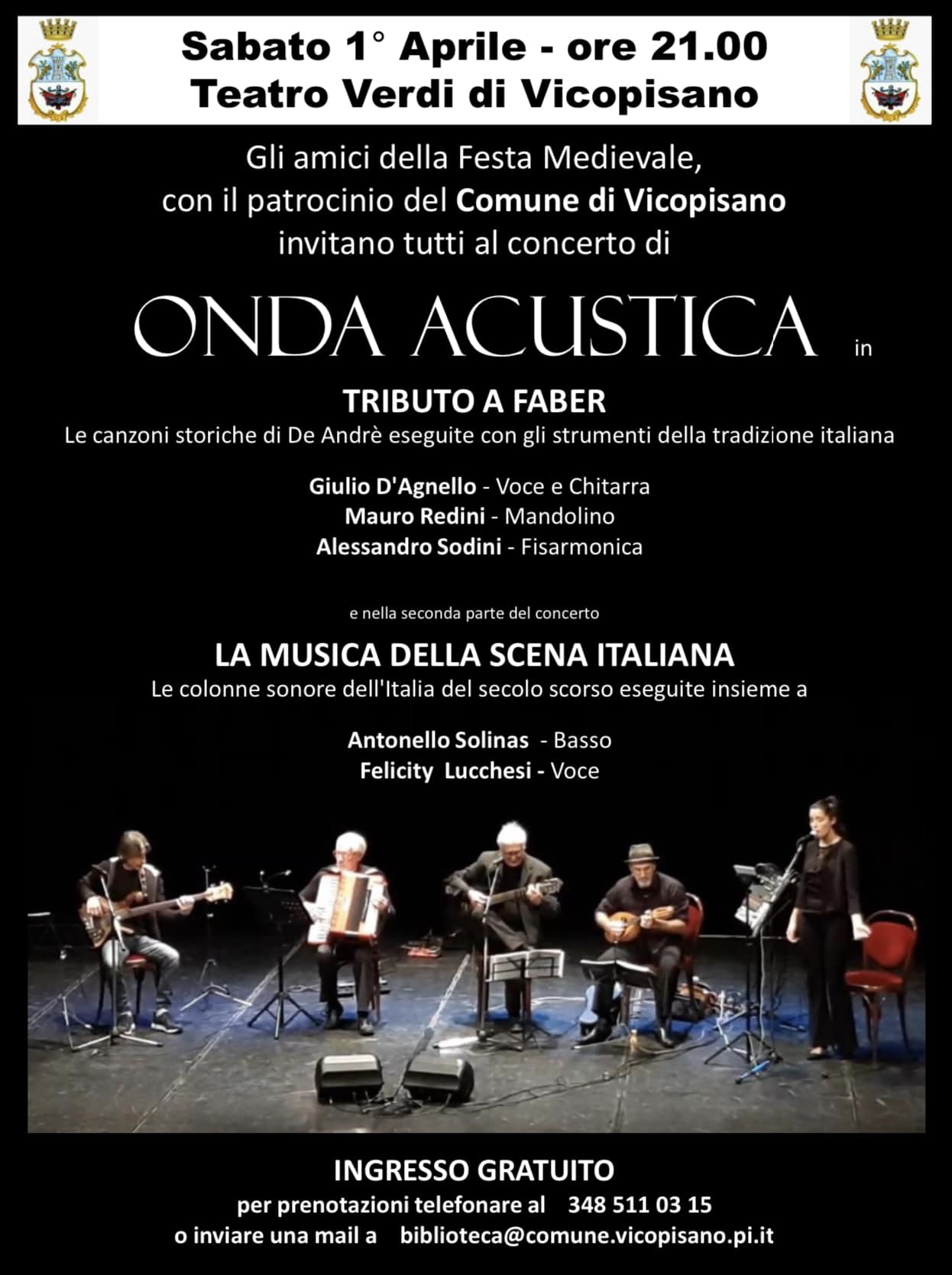 Musica e solidarietà al Teatro di via Verdi il 1° aprile, alle 21:00, gli amici della Festa Medievale di Vicopisano organizzano infatti il concerto Onda acustica che includerà un Tributo a Fabrizio De André, con le sue canzoni più belle, e La musica della scena italiana, con le colonne sonore dell’Italia del secolo scorso.