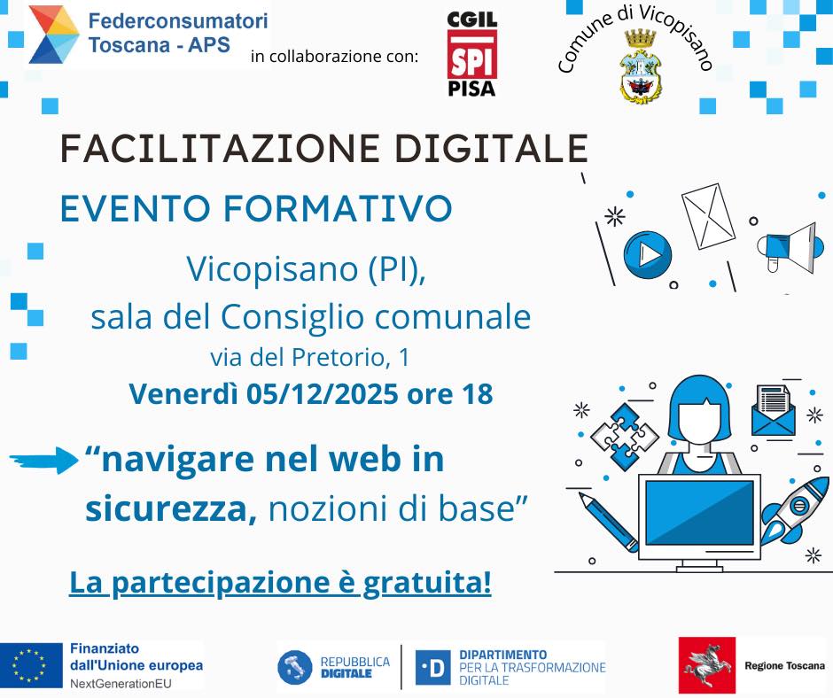 FACILITAZIONE DIGITALE – nuovo evento formativo, stavolta sulla sicurezza onlineIl Comune, in collaborazione con Federconsumatori Toscana – APS e SPI CGIL Pisa, invita cittadine e cittadini all’incontro formativo:Navigare nel web in sicurezza, nozioni di base”.Vicopisano, Sala del Consiglio comunale, venerdì 5 dicembre, alle ore 18:00. Partecipazione libera e gratuita. Un incontro importante per imparare a riconoscere, con sicurezza, le principali truffe online, proteggere i propri dati, usare in modo consapevole strumenti digitali e servizi sul web.Un’occasione utile per chi muove i primi passi nel mondo digitale, ma anche per chi vuole aggiornarsi e sentirsi più sicuro quando è connesso.Vi aspettiamo, maggiori competenze digitali significano più autonomia, più diritti e una comunità ancora più forte e inclusiva.