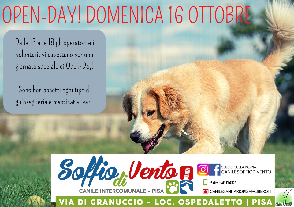 Open day del Canile Soffio di Vento, in via di Granuccio a Ospedaletto, domenica 16 ottobre, dalle 15:00 alle 18:00.