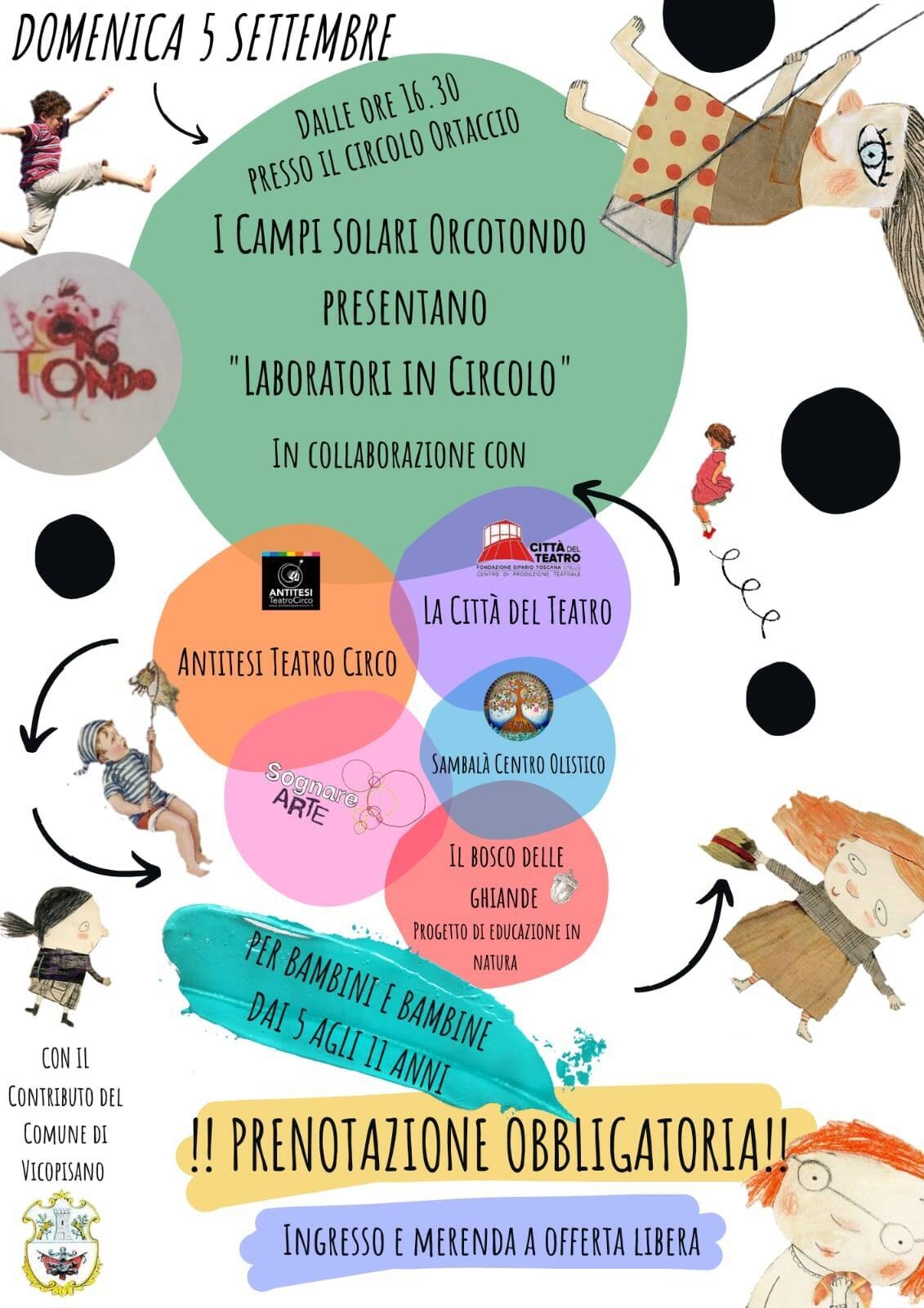 I campi solari di Orcotondo presentano, domenica 5 settembre dalle 16:30 al Circolo ARCI L'Ortaccio di Vicopisano, "Laboratori in circolo", per bambini e bambine dai 5 agli 11 anni, in collaborazione con la città del teatro , Antitesi Teatro Circo , Sognare ARTE , Sambalà Centro Olistico e Il bosco delle ghiande .