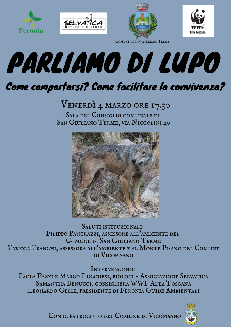 Si chiama "Parliamo di lupo. Come comportarsi? Come facilitare la convivenza?" l'evento che il Comune di San Giuliano Terme organizza in collaborazione con l'associazione Selvatica, l'associazione Feronia Guide Ambientali e il WWF Alta Toscana. Il Comune di Vicopisano ha concesso il patrocinio.