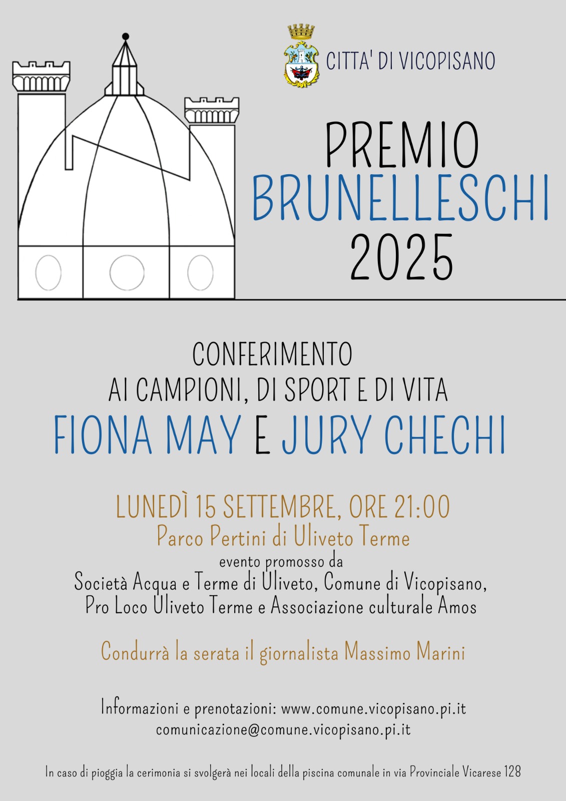 In caso di maltempo l'evento si svolgerà nei locali al coperto della Piscina Comunale di Uliveto Terme, in Via Provinciale Vicarese 128 e ne sarà data notizia.