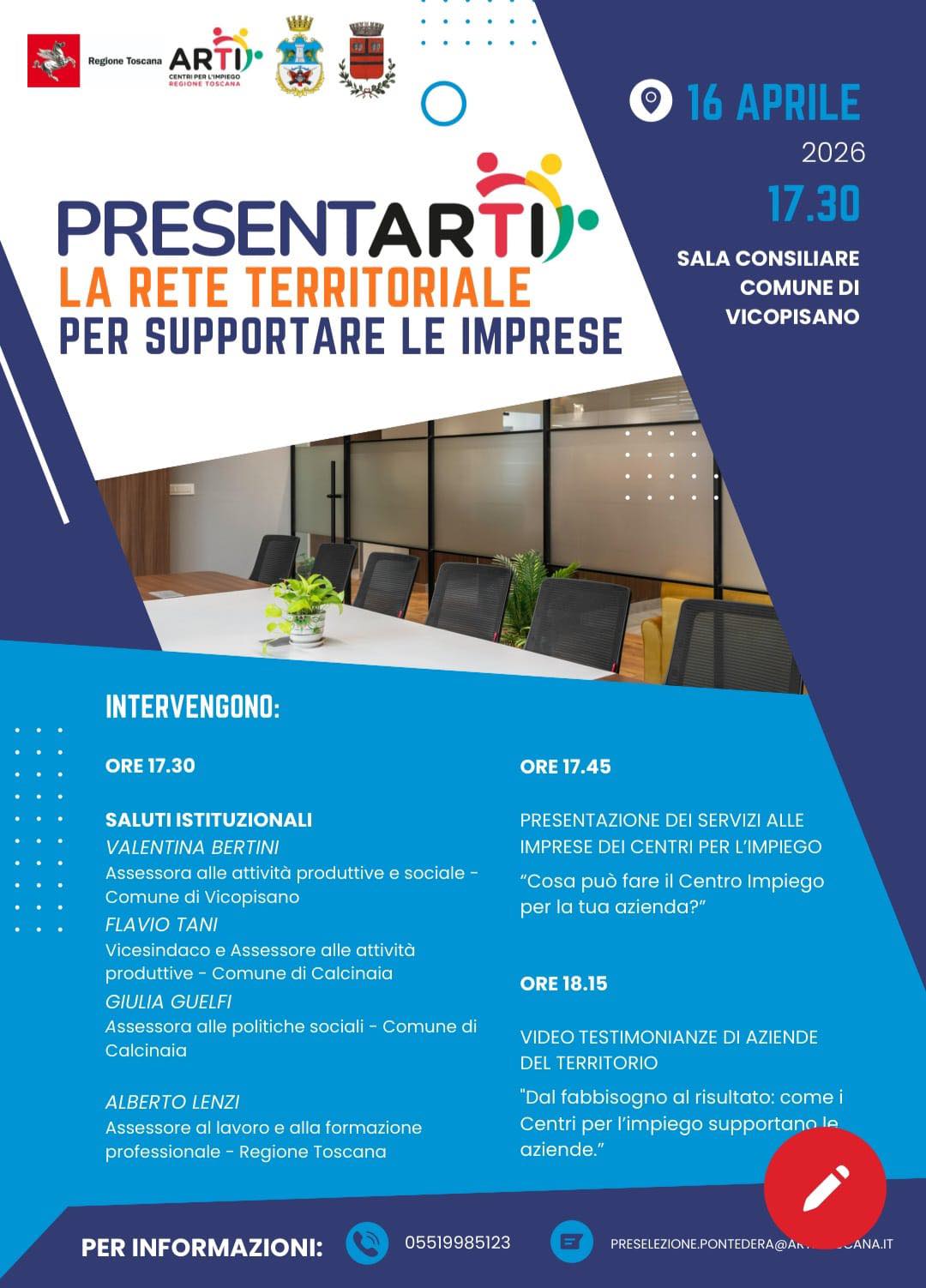 Giovedì 16 aprile, alle ore 17.30, nella Sala del Consiglio del nostro Comune, si terrà “PresentARTI – La rete territoriale per supportare le imprese”, iniziativa promossa dai Comuni di Vicopisano e di Calcinaia, in collaborazione con il Centro per l’Impiego di Pontedera – ARTI, Agenzia Regionale Toscana per l’Impiego.