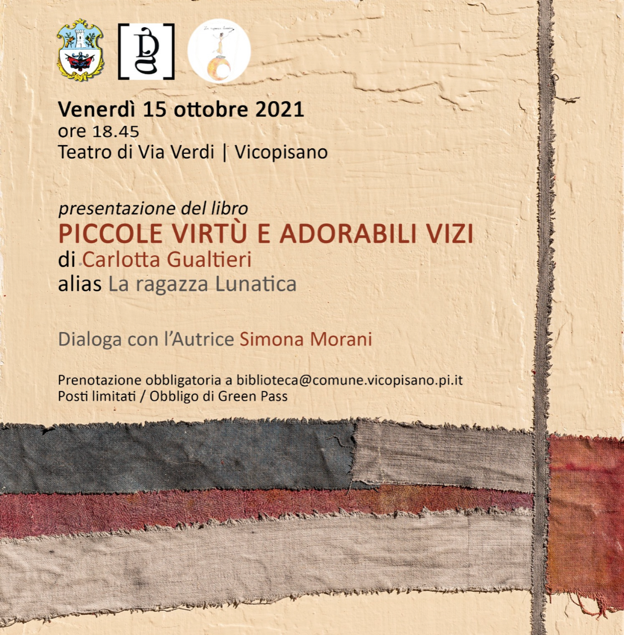 Ingresso gratuito, prenotazione obbligatoria scrivendo a: biblioteca@comune.vicopisano.pi.it, necessario essere muniti di Green Pass.