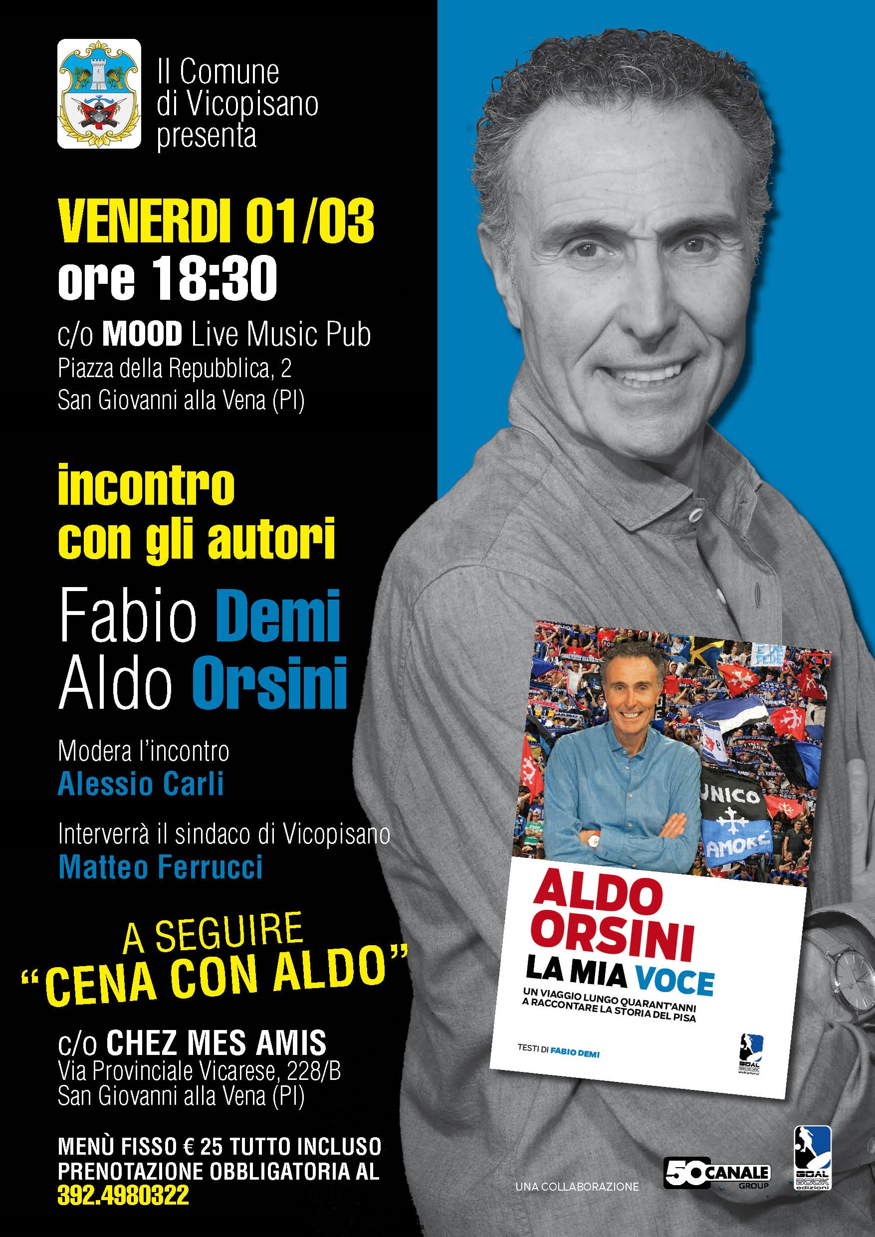 L'Amministrazione Comunale di Vicopisano ha organizzato, in collaborazione con 50 Canale e Goal Book Edizioni, un evento di presentazione del libro "Aldo Orsini, la mia voce. Un viaggio lungo quarant'anni per raccontare la storia del Pisa" con gli autori Fabio Demi e Aldo Orsini, venerdì 1° marzo, alle 18:30, al Mood Live Music Pub, in Piazza della Repubblica a San Giovanni alla Vena. Modererà l'incontro il giornalista Alessio Carli e interverrà il Sindaco Matteo Ferrucci.