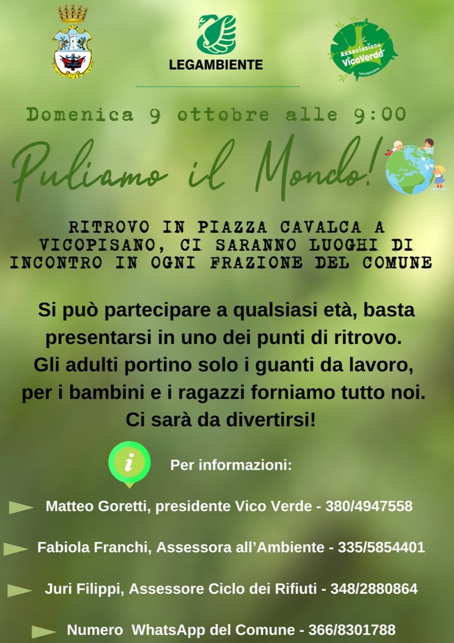 L'Amministrazione Comunale invita la cittadinanza, e in particolare i più piccoli e i più giovani, a prendere parte a questa nuova, grande giornata di pulizia del nostro territorio, in collaborazione con Circolo Legambiente Pisa, Vico Verde, il Parlamentino degli studenti e delle studentesse e tante nostre associazioni a supporto.