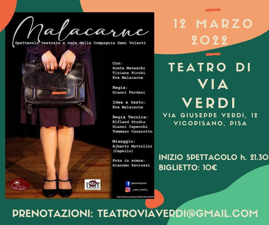 Sabato 12 marzo, alle 21:30, la Compagnia Semi Volanti porterà in scena al Teatro di via Verdi: MALACARNE, idea e testo di Eva Malacarne.