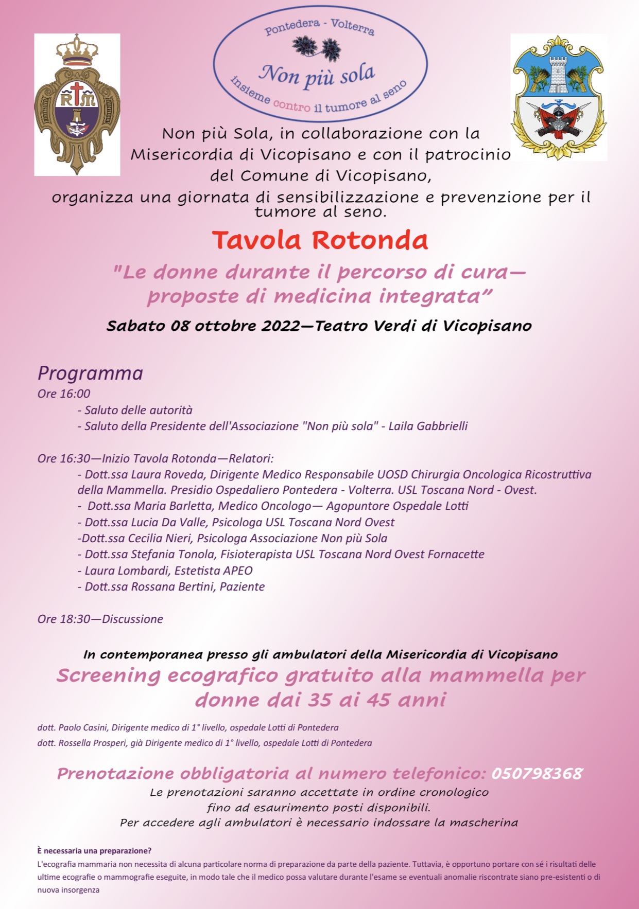 L'Associazione Non più sola di Pontedera-Volterra, in collaborazione con la Misericordia di Vicopisano, con il patrocinio del Comune e il coordinamento della notaia vicarese Maria Antonietta Denaro, ha organizzato una importante giornata di sensibilizzazione e di prevenzione, per quanto riguarda il tumore al seno.