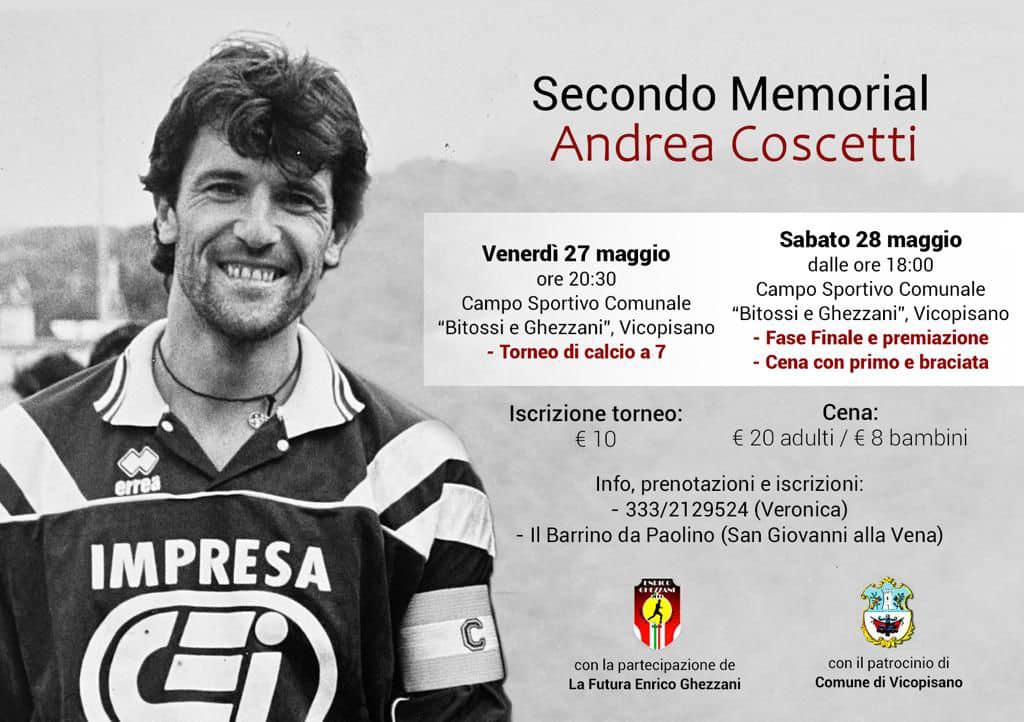 Secondo Memorial Andrea Coscetti, ancora una volta, nel campo sportivo comunale Bitossi-Ghezzani di San Giovanni alla Vena, il 27 e 28 maggio, si giocherà un torneo di calcio a 7 con tantissima emozione.