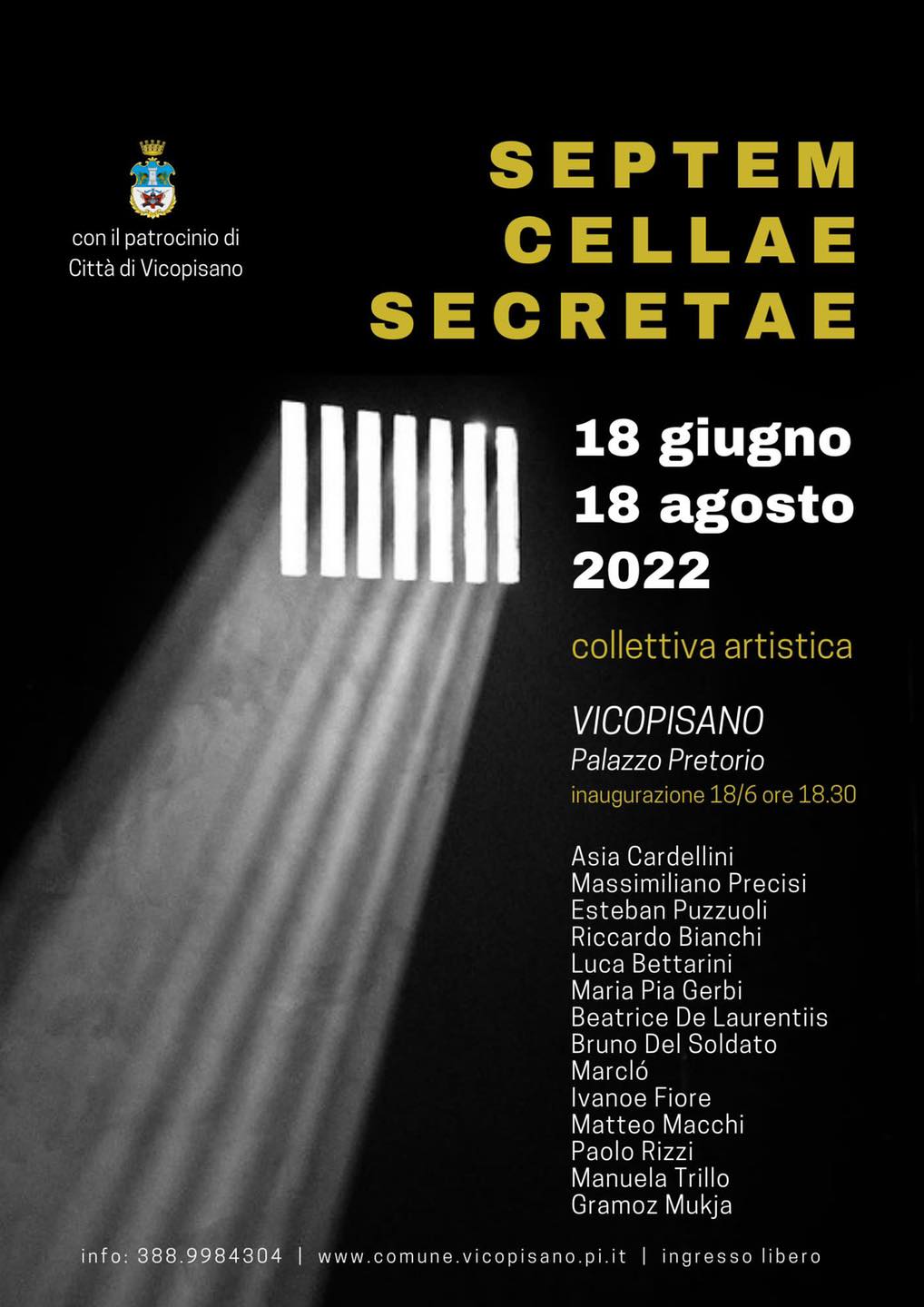 Septem Cellae Secretae, mostra aperta in notturna il 24 giugno, dalle 21:00 alla mezzanotte Nelle antiche carceri di Palazzo Pretorio a Vicopisano i 14 artisti daranno vita ad alcune performance dal vivo. Live performance degli artisti e apertura in notturna, dalle 21:00 alla mezzanotte, per la mostra "Septem Cellae Secretae", nelle antiche carceri di Palazzo Pretorio a Vicopisano. Ingresso libero e gratuito, il 24 giugno. Inaugurata il 18 giugno, con grande successo di pubblico per tutto il weekend, la collettiva artistica è stata ideata dai pittori Massimiliano Precisi e Asia Cardellini, con la collaborazione dell'Assessora Fabiola Franchi e della responsabile dell'Ufficio Cultura, Simona Morani, e coinvolge 14 artisti e artiste, pittori, scultori e fotografi. Il luogo estremamente particolare e le sue celle sono stati organizzati in modo suggestivo dagli artisti che hanno interpretato ottimamente lo spazio a disposizione e i numerosi graffiti e disegni, ben visibili, lasciati dalle persone che erano rinchiuse nelle carceri. L'ossimoro culturale, tra arte come massima espressione di libertà e prigionia, riesce, in questo modo, ad amplificare le emozioni dei visitatori. Da qui la prima sorpresa della mostra, che resterà aperta fino al 18 agosto (il venerdì dalle 17:00 alle 19:00 e negli orari di apertura al pubblico di Palazzo Pretorio e della Rocca del Brunelleschi, per le visite guidate dei monumenti a cura del Gruppo Culturale Ippolito Rosellini, il sabato pomeriggio dalle 15:00 alle 19:00 e la domenica dalle 10:00 alle 12:30 e dalle 15:00 alle 19:00), ovvero l'apertura in notturna il 24 giugno con le performance dal vivo degli artisti: Asia Cardellini, Massimiliano Precisi, Riccardo Bianchi, Esteban Puzzuoli, Maria Pia Gerbi, Matteo Macchi, Paolo Rizzi, Bruno Del Soldato, Manuela Trillo, Beatrice De Laurentiis, Marco Lombardi, Luca Bettarini, Ivanoe Fiore e Gramoz Mukja. Per informazioni 338/9984304+6Vedi insights e inserzioniMetti in evidenza il post42Tu, Farigu Alessandro Photography e altri 40Condivisioni: 3Mi piaceCommentaCondividi