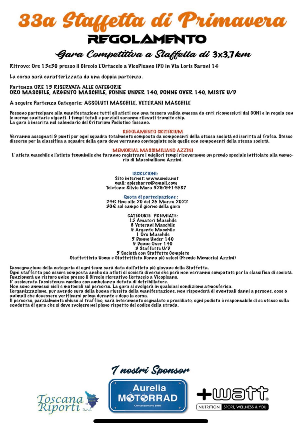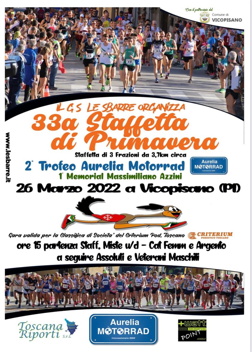 33a edizione della Staffetta di Primavera, organizzata dal Gruppo Sportivo Le Sbarre, domani tra le 15:00 e le 17:20 a Vicopisano.