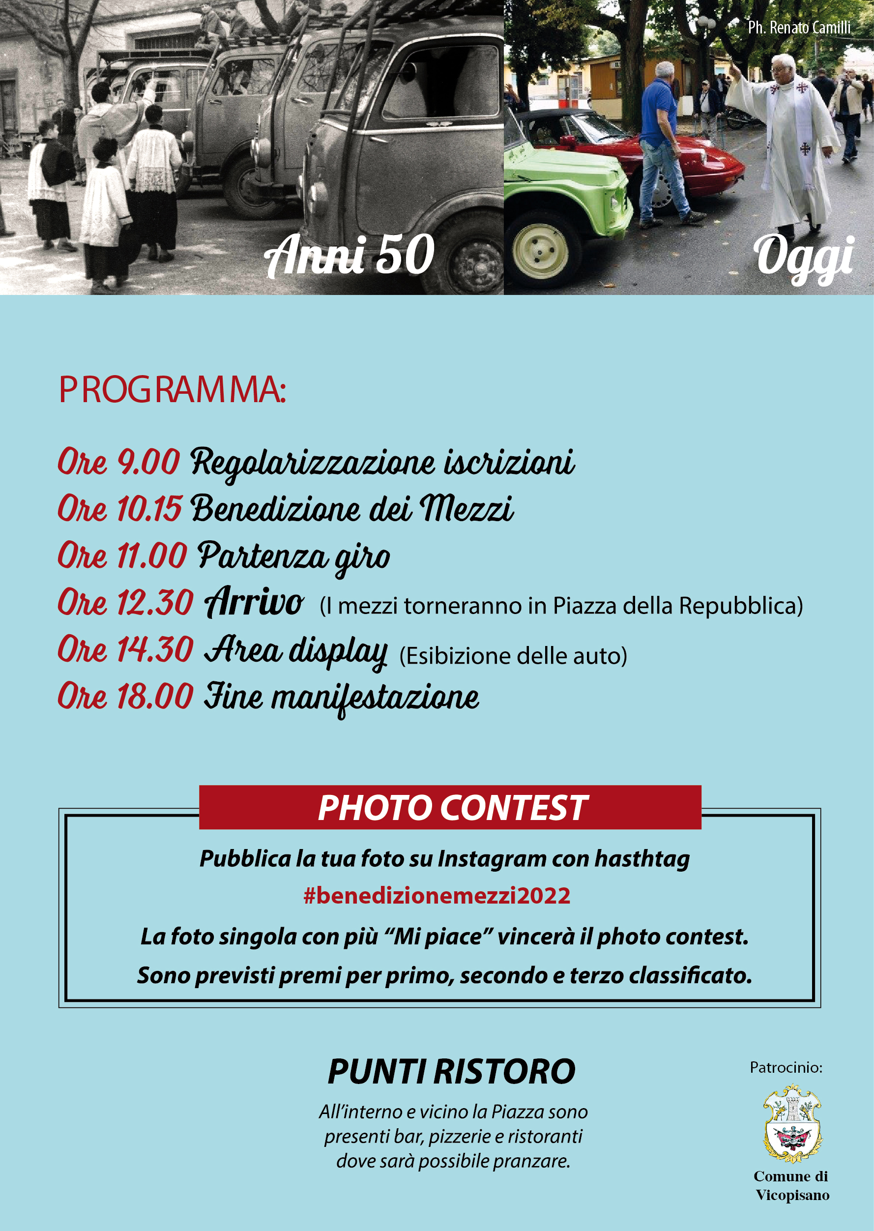 - Alle 9:00 regolarizzazione iscrizioni;- alle 10:15 benedizione dei mezzi;- alle 11:00 partenza del giro, che toccherà i Comuni di Bientina e di Buti, e alle 12:30 rientro;- alle 14:30 esibizione delle auto, la manifestazione si concluderà alle 18:00.Non perdetevi il Photo Contest, pubblicate la vostra foto su Instagram con l'hashtag #benedizionedeimezzi2022. Quella che otterrà più cuoricini vincerà, sono previsti premi anche per la seconda e terza classificata.