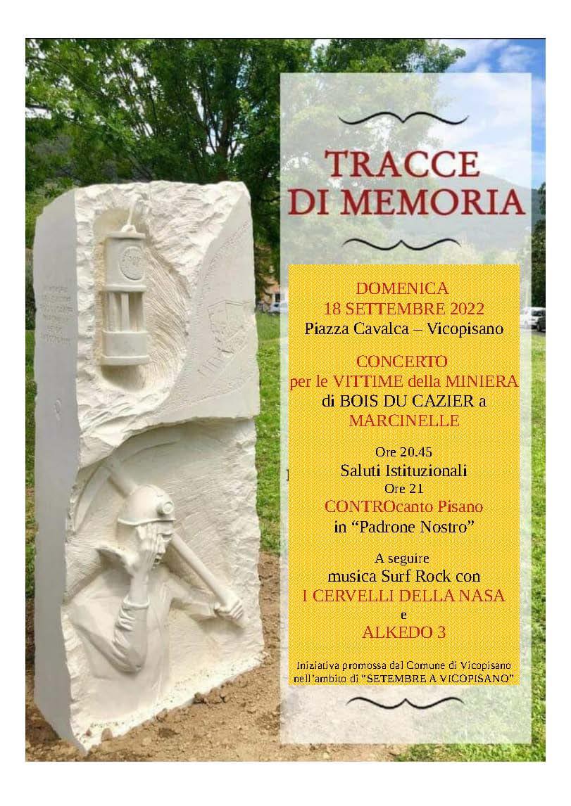 Domenica 18 settembre, dalle ore 20:45, in Piazza Cavalca a Vicopisano “Tracce di Memoria”, concerto in memoria delle vittime della miniera di Bois su Cazier, a Marcinelle, in Belgio.