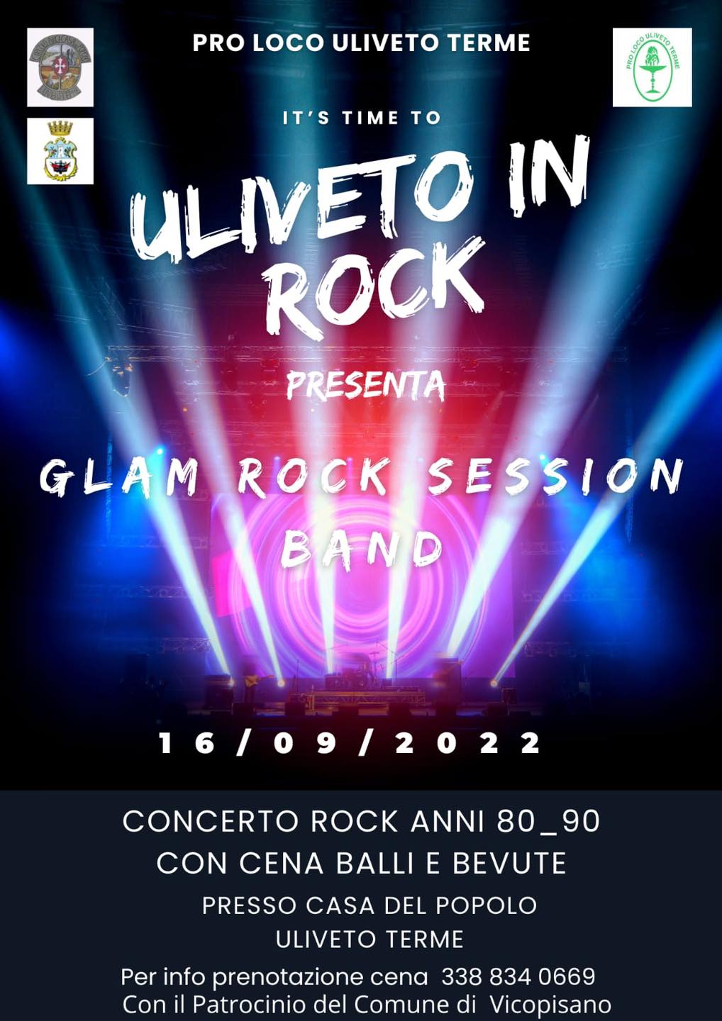 Venerdì 16 settembre la Pro Loco Uliveto Terme presenta Glam Rock Session Band, concerto rock anni Ottanta e Novanta, con cena e ballo, al Circolo Arci Casa Del Popolo di Uliveto Terme.